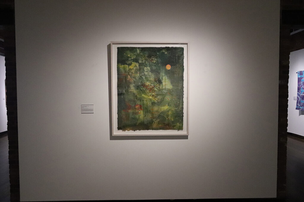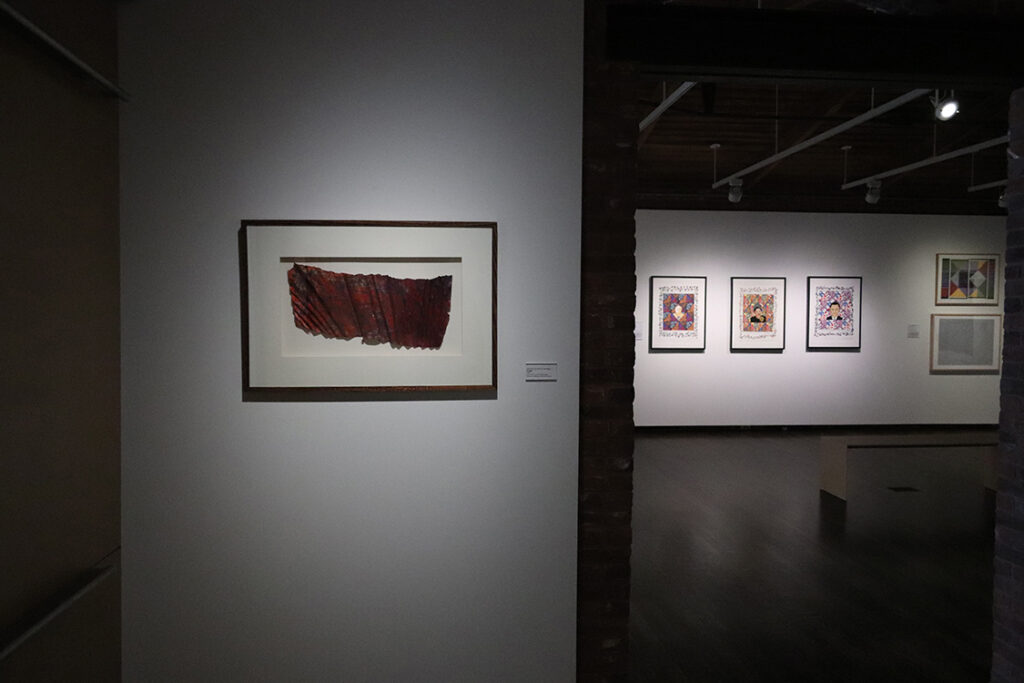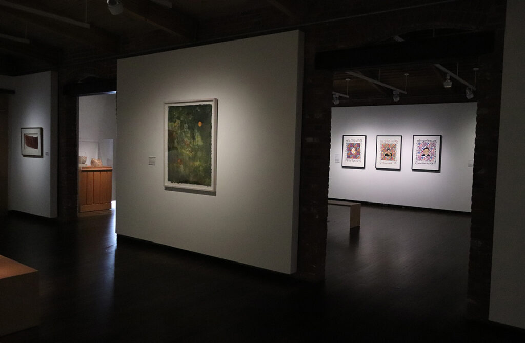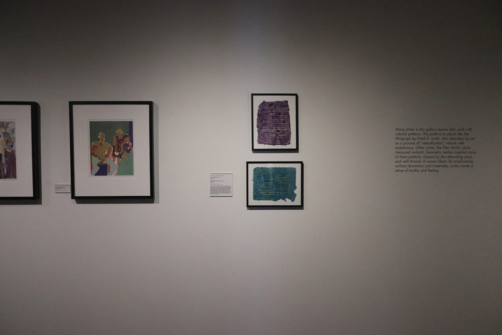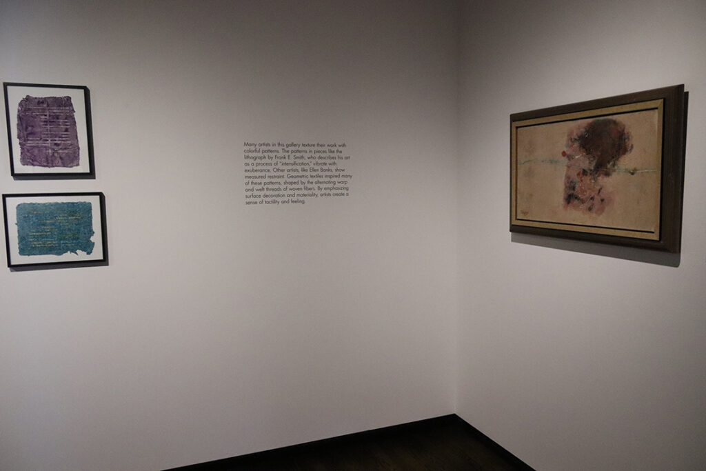 Many artists in this gallery texture their work with colorful patterns. The patterns in pieces like the lithograph by Frank E. Smith, who describes his art as a process of “intensification,” vibrate with exuberance. Other artists, like Ellen Banks, show measured restraint. Geometric textiles inspired many of these patterns, shaped by the alternating warp and weft threads of woven fibers. By emphasizing surface decoration and materiality, artists create a sense of tactility and feeling.