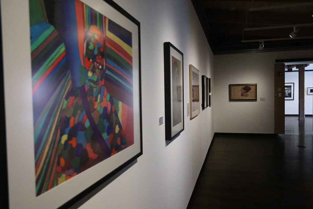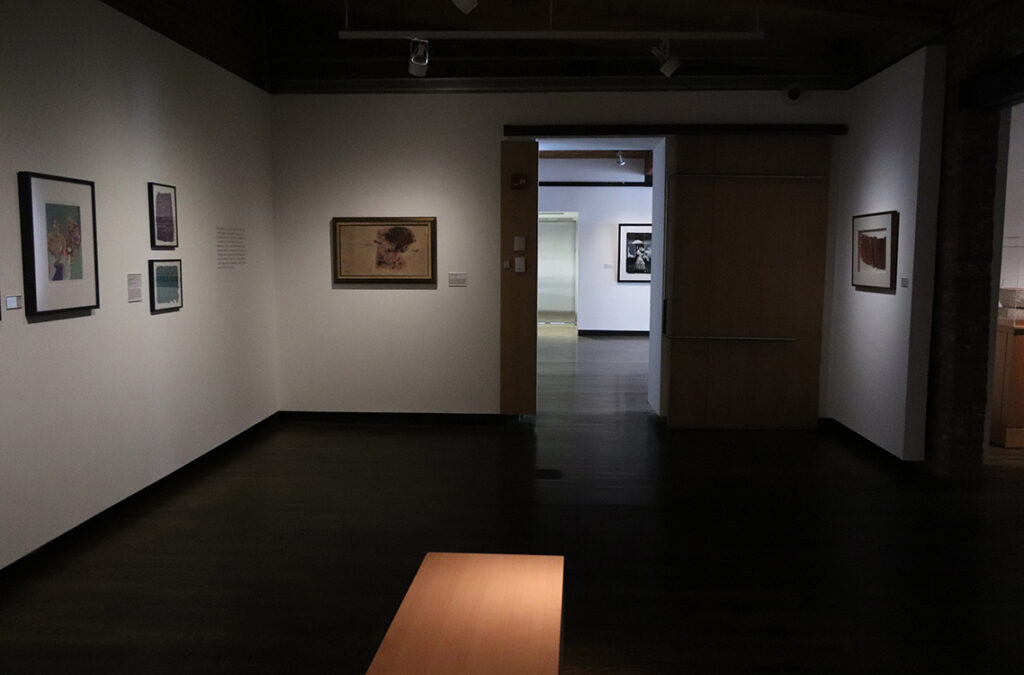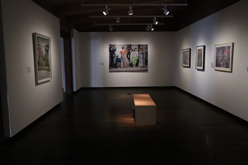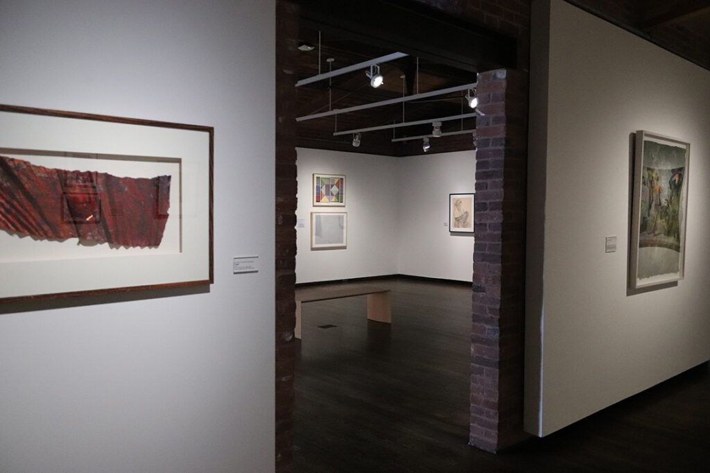 Many artists in this gallery texture their work with colorful patterns. The patterns in pieces like the lithograph by Frank E. Smith, who describes his art as a process of “intensification,” vibrate with exuberance. Other artists, like Ellen Banks, show measured restraint. Geometric textiles inspired many of these patterns, shaped by the alternating warp and weft threads of woven fibers. By emphasizing surface decoration and materiality, artists create a sense of tactility and feeling.