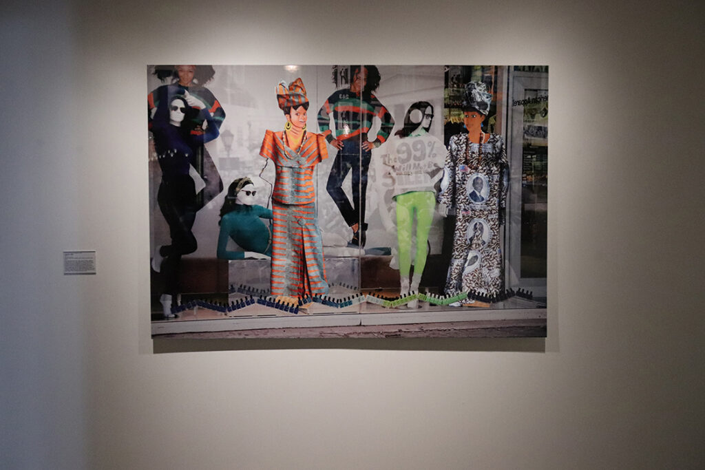 The recognizable logo of the clothing store American Apparel is visible, reversed, in the upper righthand corner of the storefront in Voguish Vista. American Apparel was well known for the tightly fitting, monochromatic clothes the mannequins wear in the background. But the beautifully patterned dresses and turbans of the two women in the front suggest that not everything is as it seems. Nigerian artist Fatimah Tuggar digitally layers imagery to create what she describes as an “alternative imaginary” to the world we inhabit. Boldly holding the center of the scene, the two women seem to ask, “What is ‘American’ apparel anyway?”