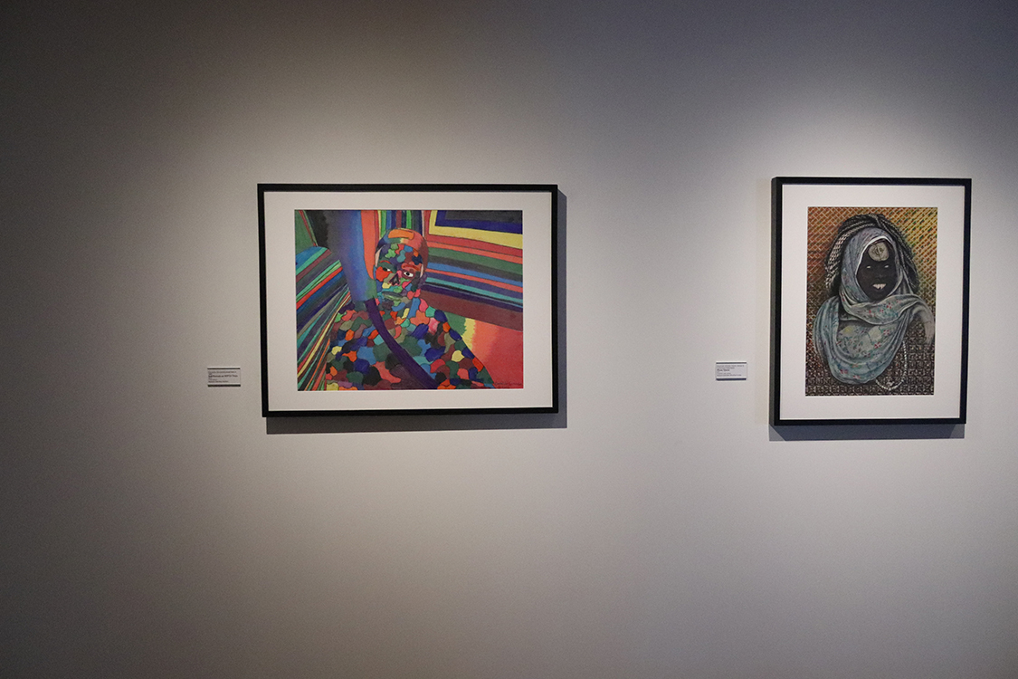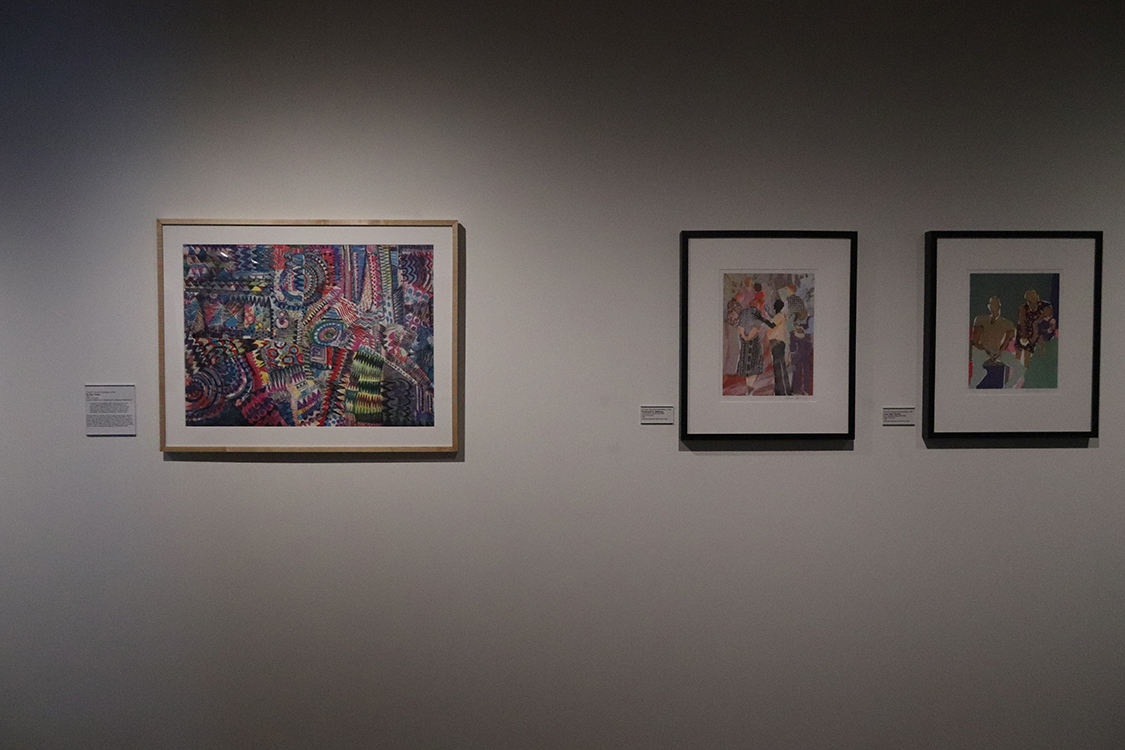 Many artists in this gallery texture their work with colorful patterns. The patterns in pieces like the lithograph by Frank E. Smith, who describes his art as a process of “intensification,” vibrate with exuberance. Other artists, like Ellen Banks, show measured restraint. Geometric textiles inspired many of these patterns, shaped by the alternating warp and weft threads of woven fibers. By emphasizing surface decoration and materiality, artists create a sense of tactility and feeling.